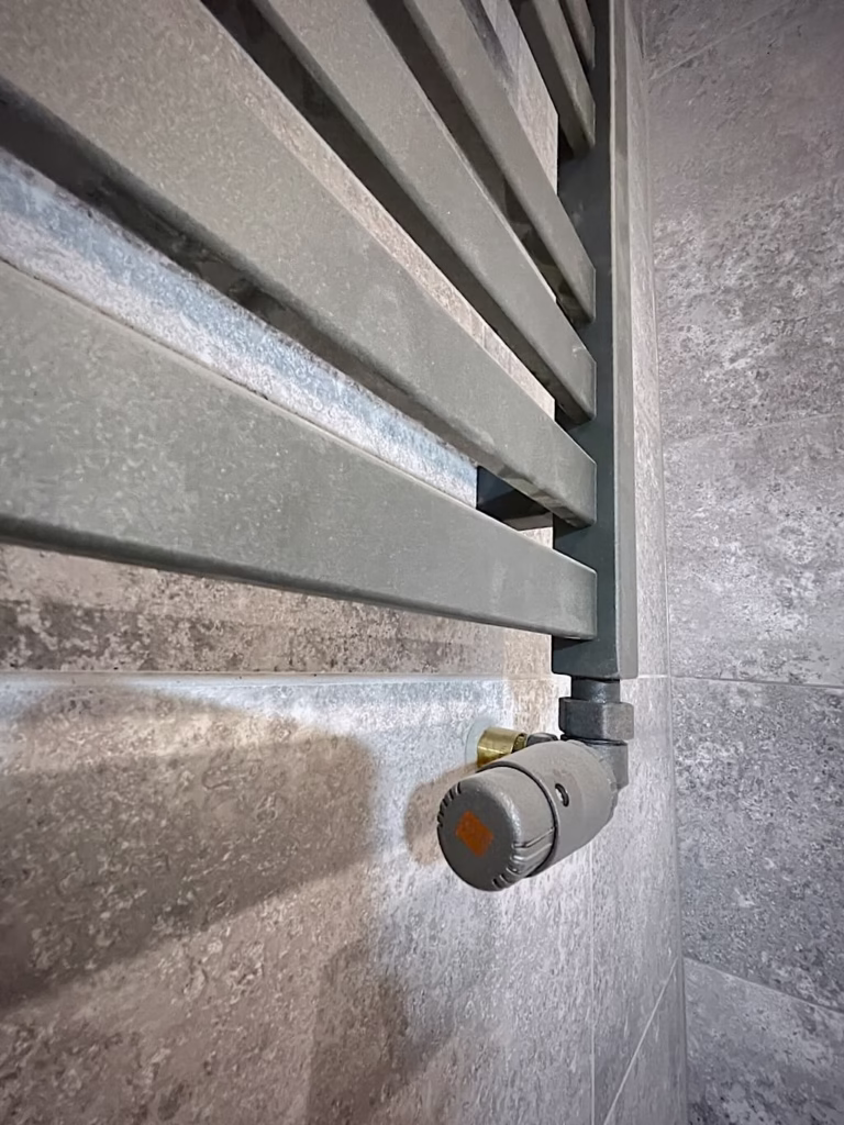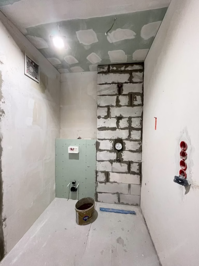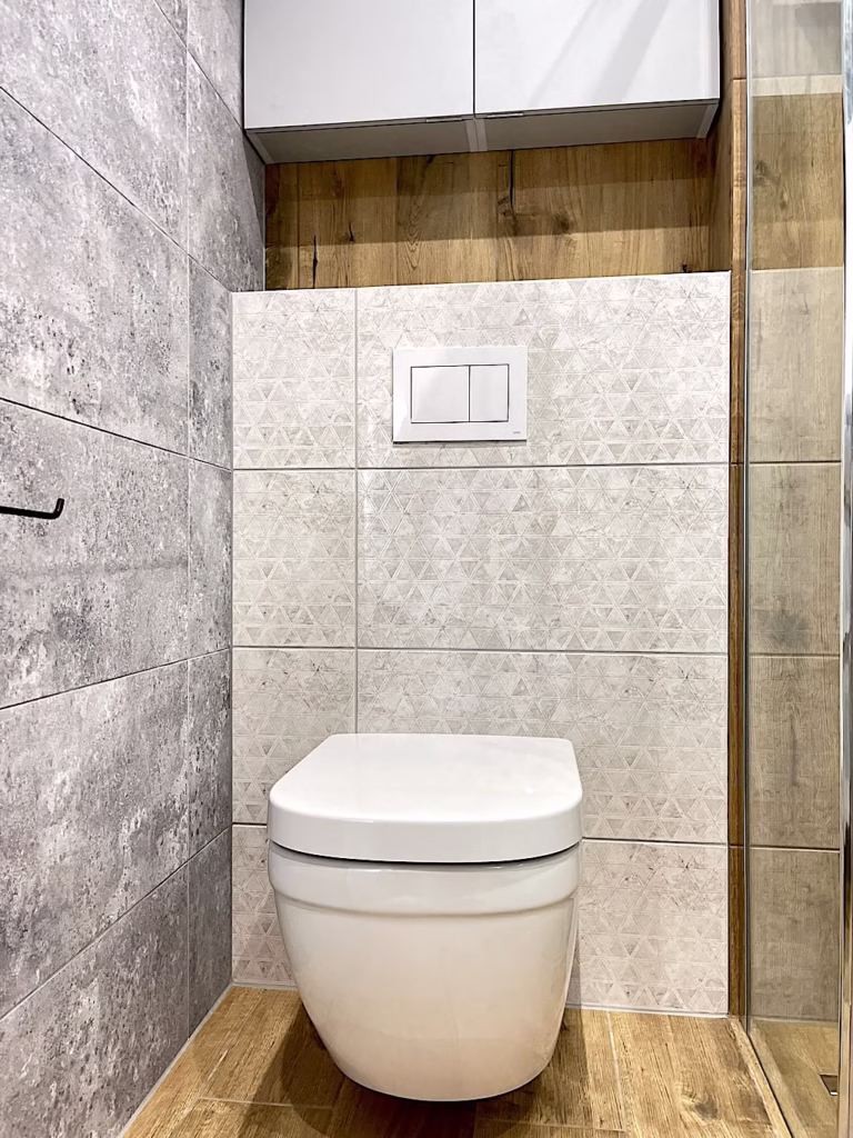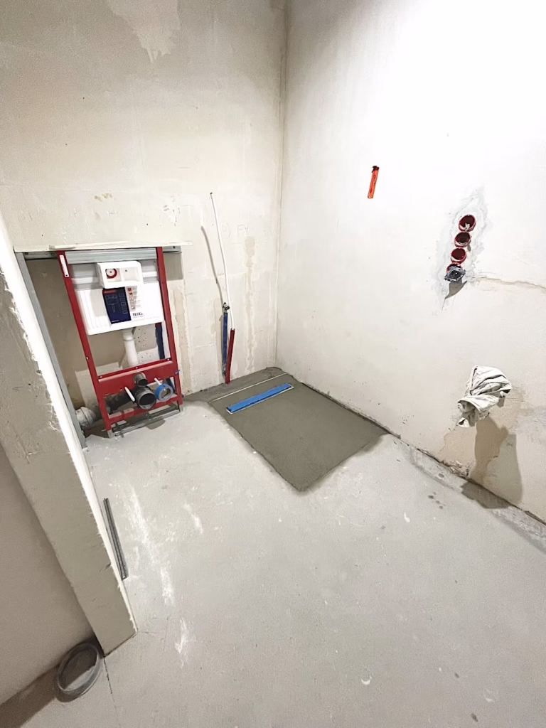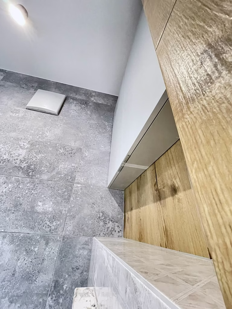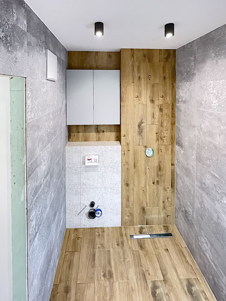 Wykończenie łazienki od stanu deweloperskiego, gruntowanie, hydroizolacja, odpływ liniowy, zabudowa toalety, układanie kafli, montaż kabiny.