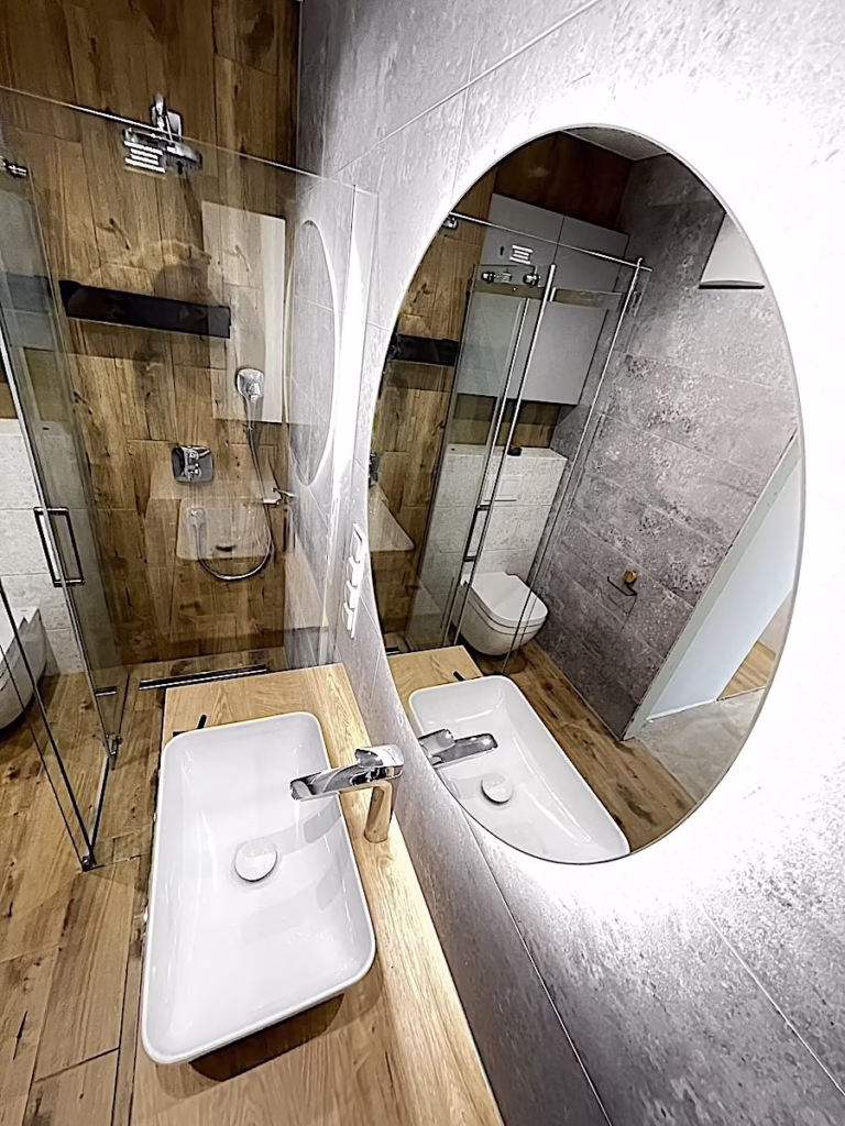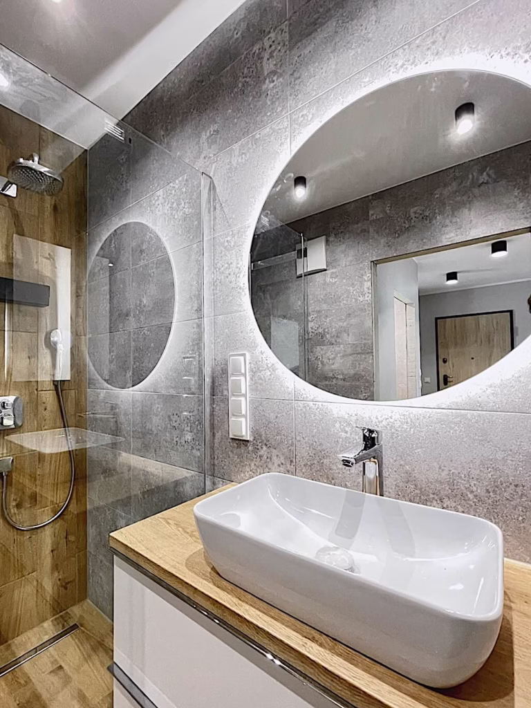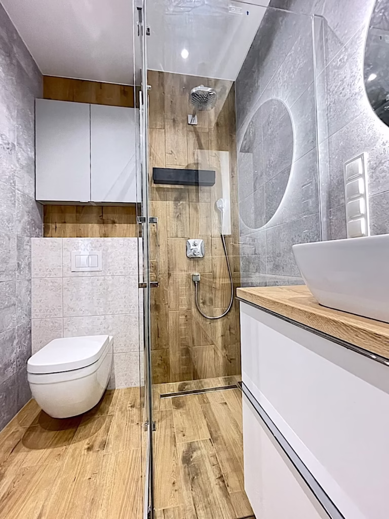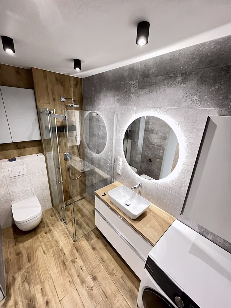 Łazienka w minimalistycznym stylu – połączenie surowego betonu z naturalnym drewnem. Elegancka szklana kabina prysznicowa z odpływem liniowym, wisząca toaleta dla większej lekkości wizualnej. Praktyczna umywalka z szafką zapewnia funkcjonalność, a okrągłe lustro z podświetleniem dodaje wnętrzu wyjątkowego charakteru i elegancji.